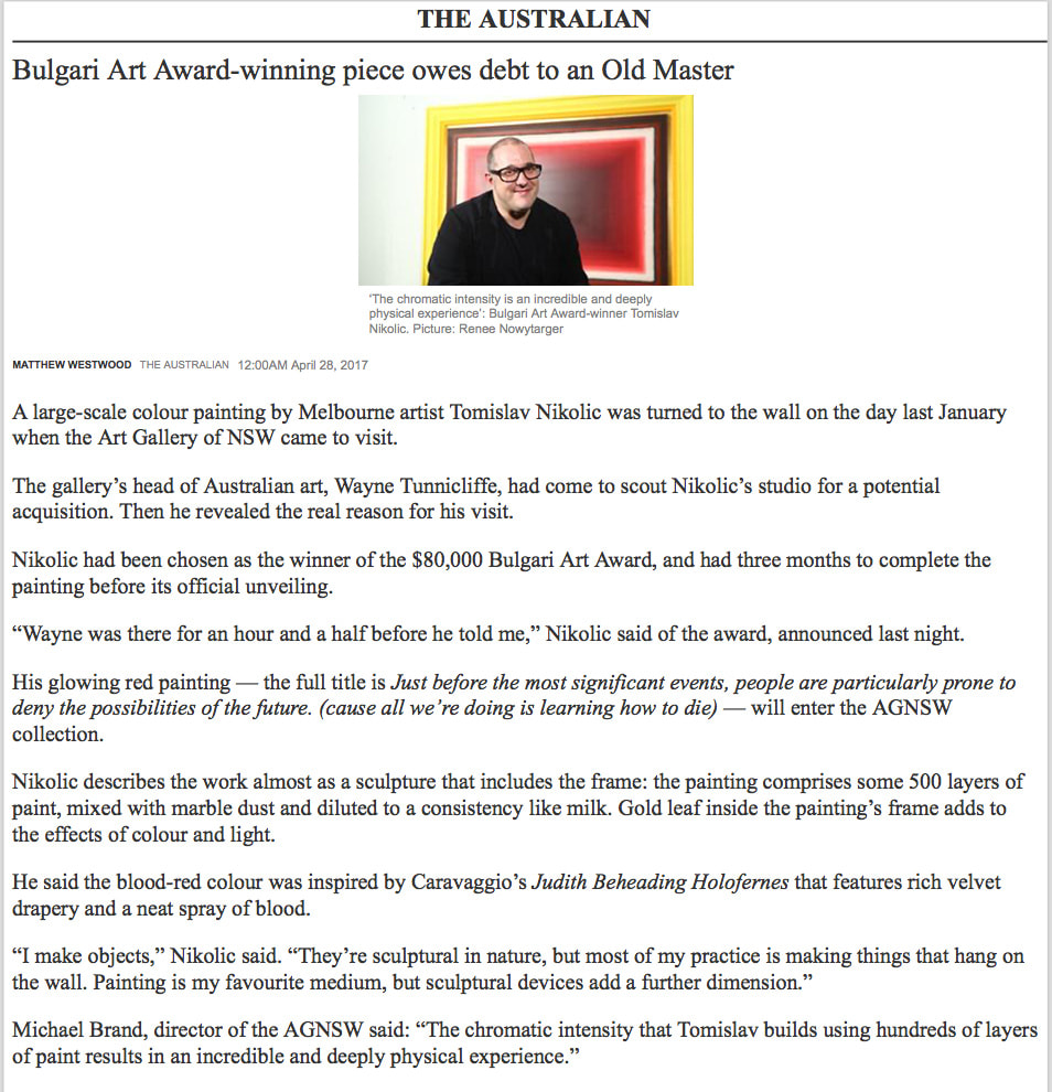 Gabriella Coslovich, Bulgari Art Award 2017 winner Tomislav Nikolic, AFR Magazine, 27 April 2017