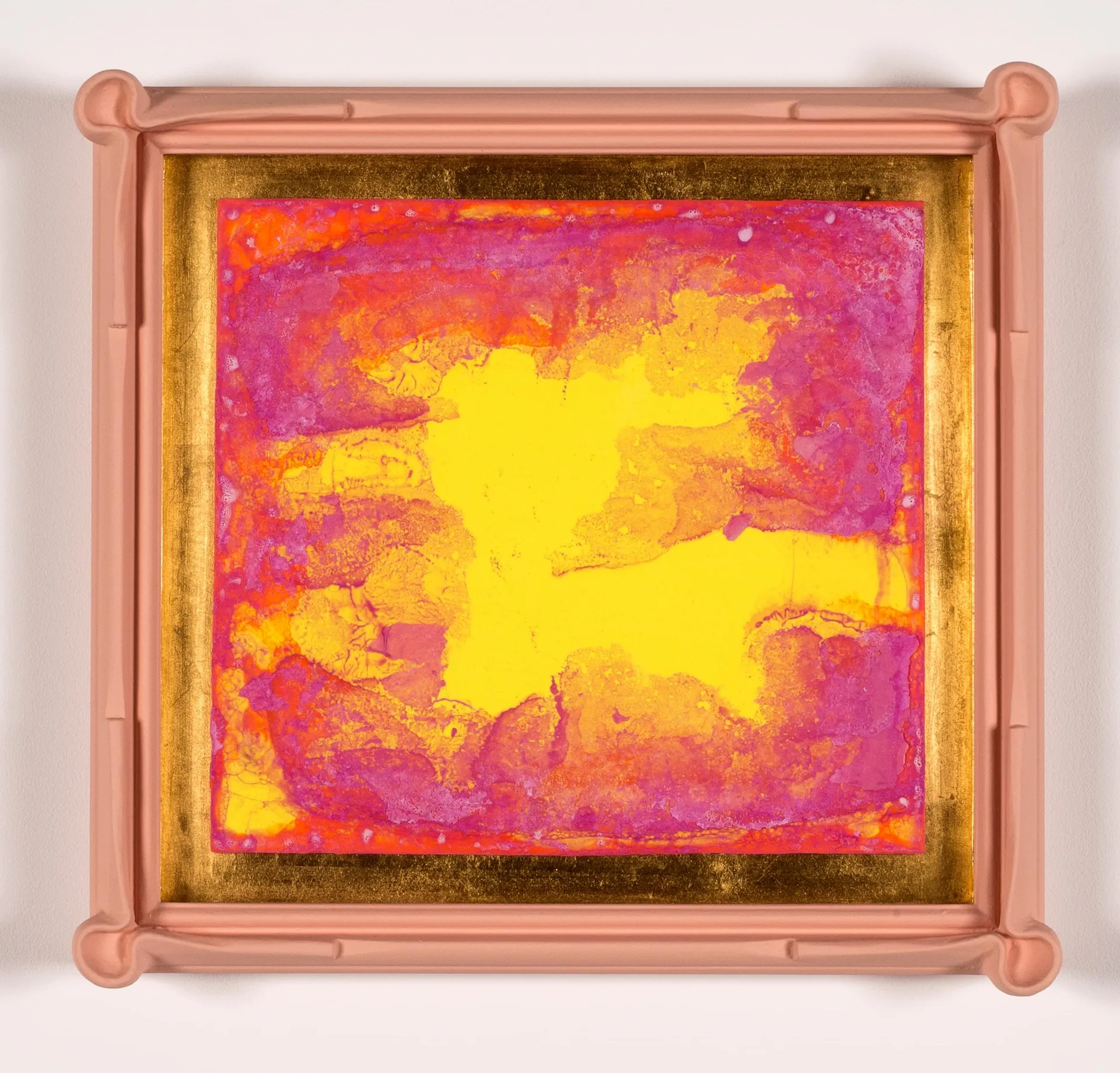 synthetic polymer, marble dust, museum glass, 23ct red gold leaf on paper, composition and wood