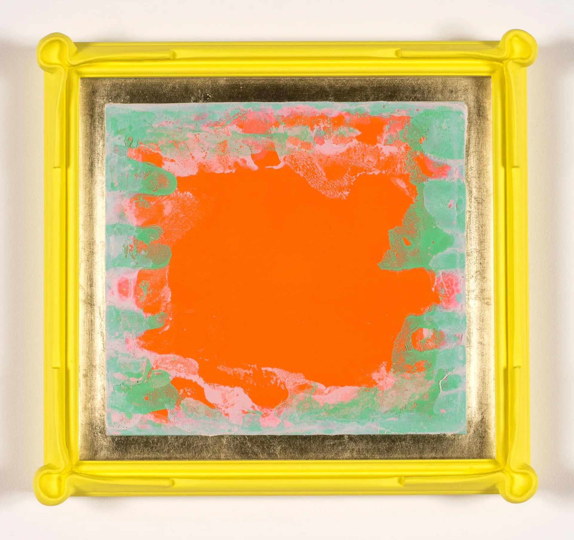 synthetic polymer, marble dust, museum glass, 16ct green gold leaf on paper, composition and wood